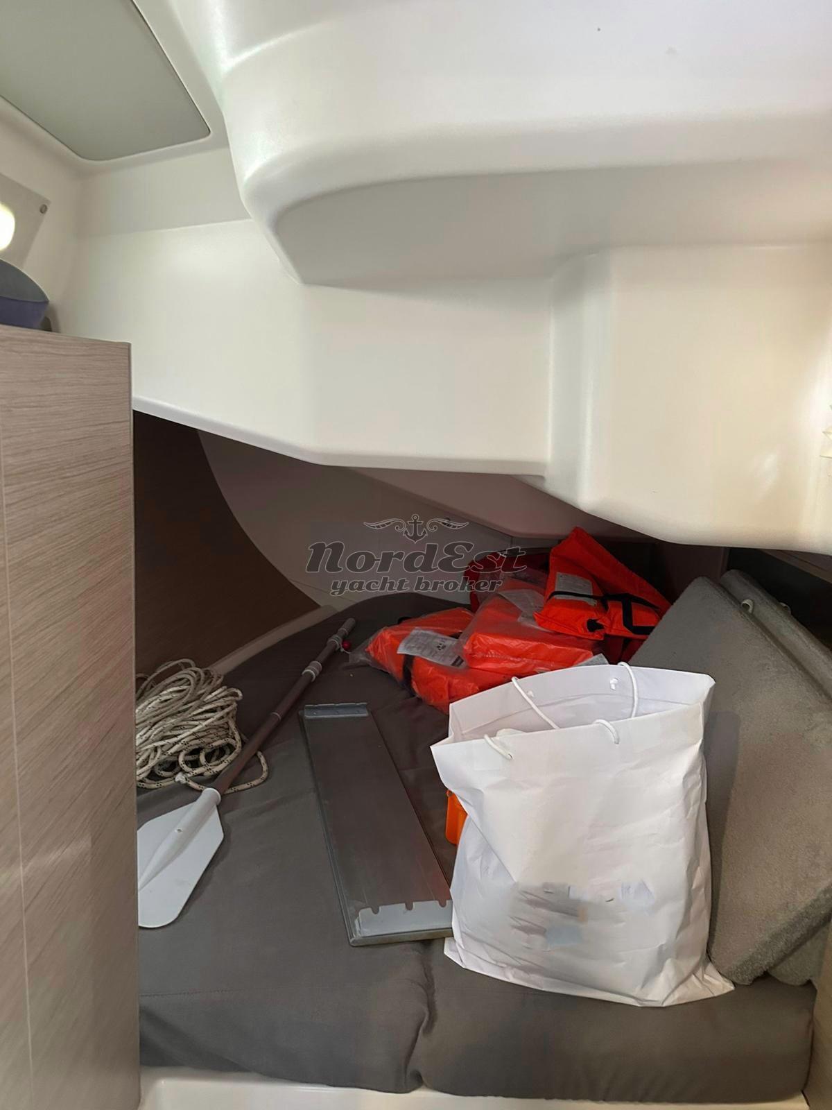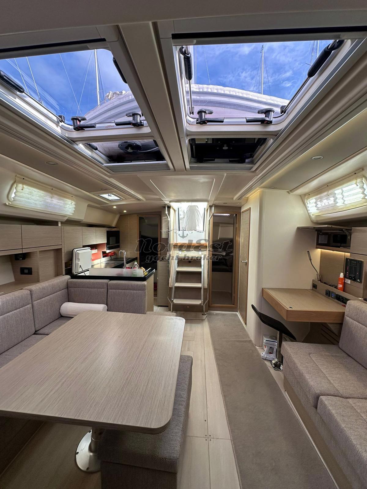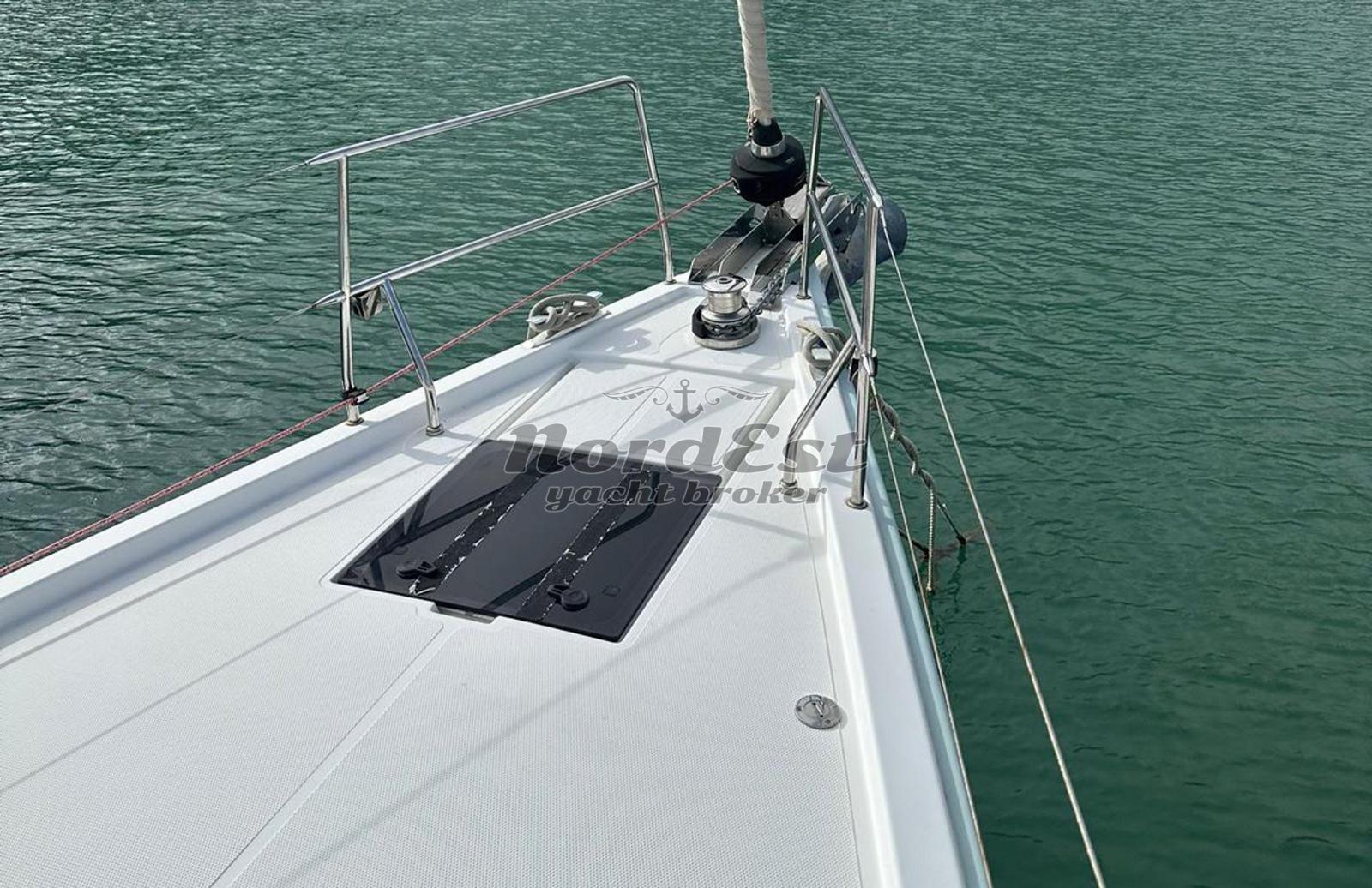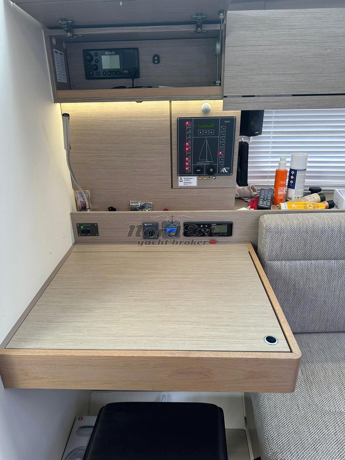 Layout: Versione 3 cabine doppie e 2 servizi Unico proprietario Vele: Set Elvstrom Triradiali (Randa Full Batten e Fiocco autovirante); Code 0 con frullone Elettronica: Doppia stazione B&G con supporti Naupod alle timonerie; Windex Energia & Comfort (Refit 2024): Impianto Aria Condizionata; 4 pannelli solari; Inverter 1500W Estetica & Coperta: Scafo grigio e tuga in teak; doppie ruote in carbonio bianche; cappe protettive per tavolo e timoni Manovre & Ormeggio: Verricello con campana di tonneggio (nuovo 2024); Ancora Delta 20kg con 60m di catena e contametri; tenditore strallo di poppa
